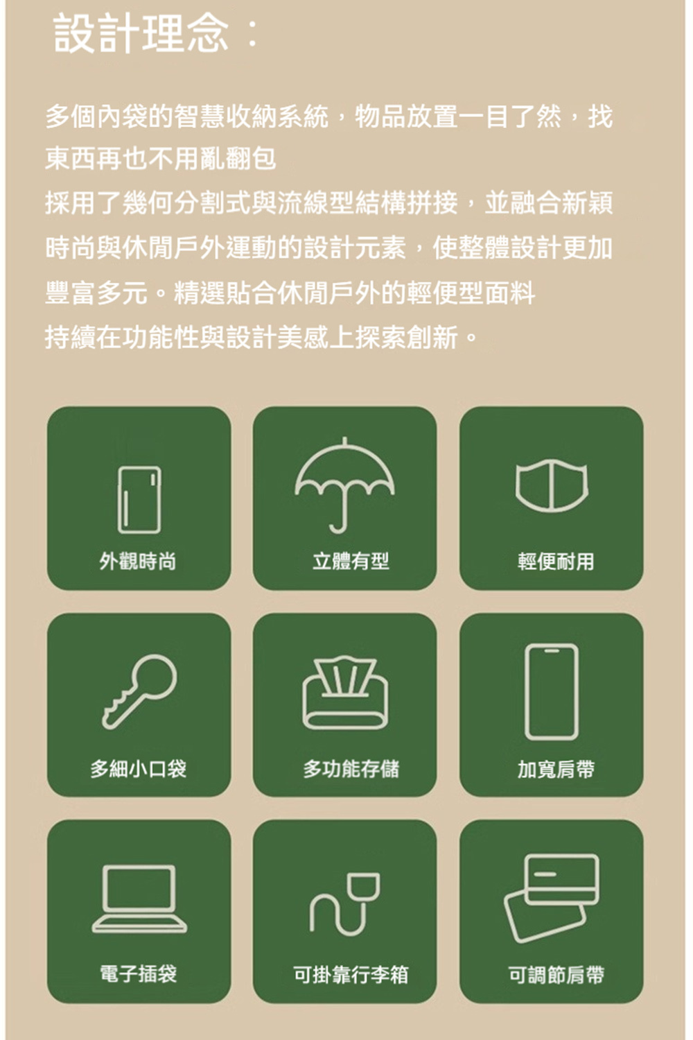 👜結構:主袋、內貼袋*4、前拉鍊袋、前插扣袋、側袋*2、後拉鍊袋