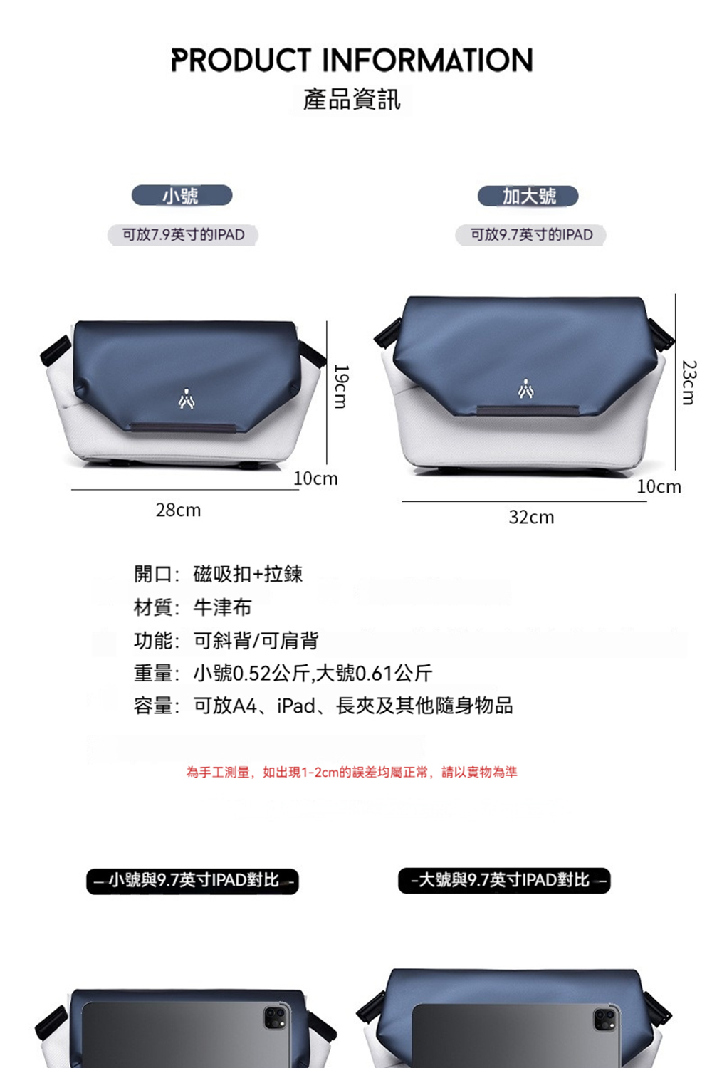 👜容量:可放A4、iPad、長夾及其他隨身物品