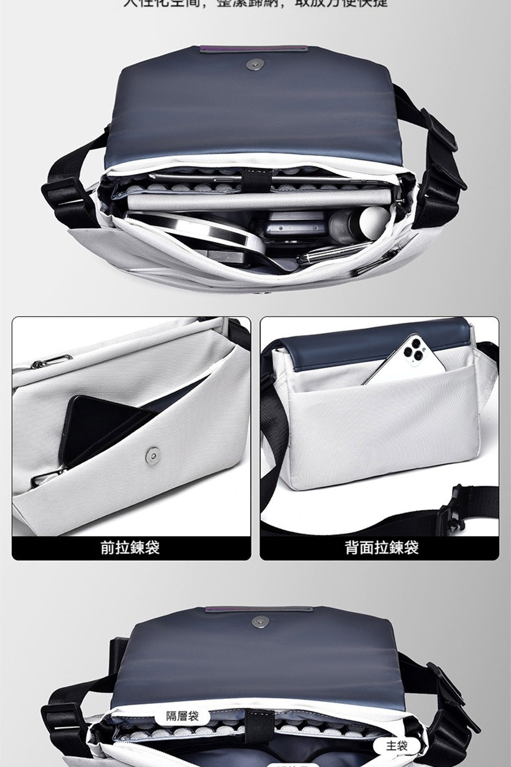 👜結構:主袋、內貼袋*2、層帶、後拉鍊袋、前拉鍊袋