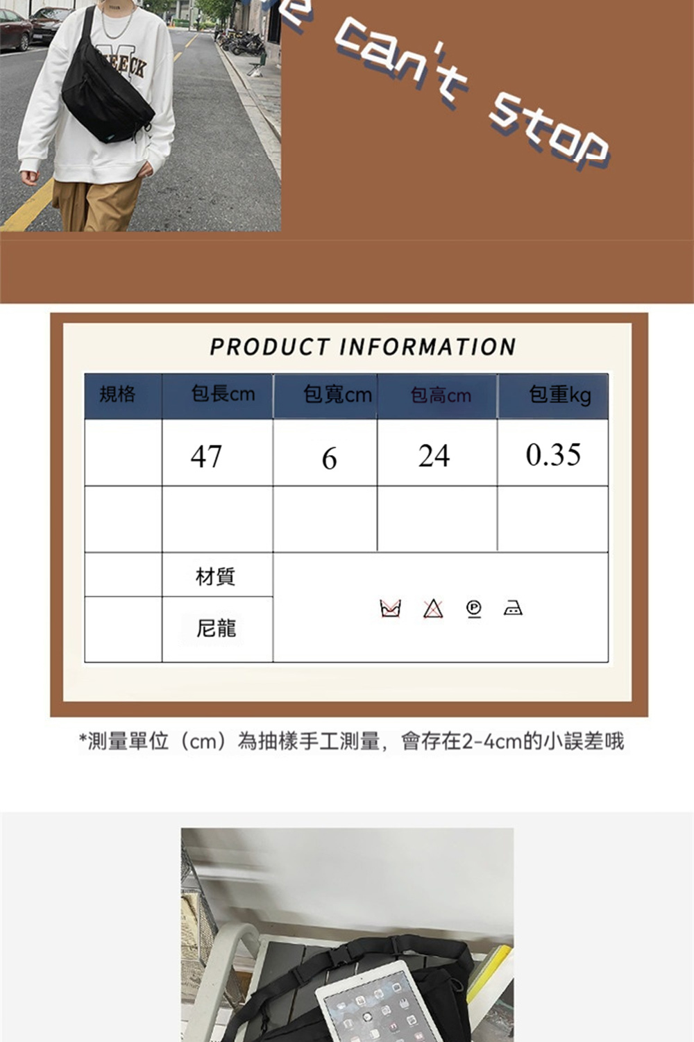 👜容量:可放A4、iPad、長夾及其他隨身物品