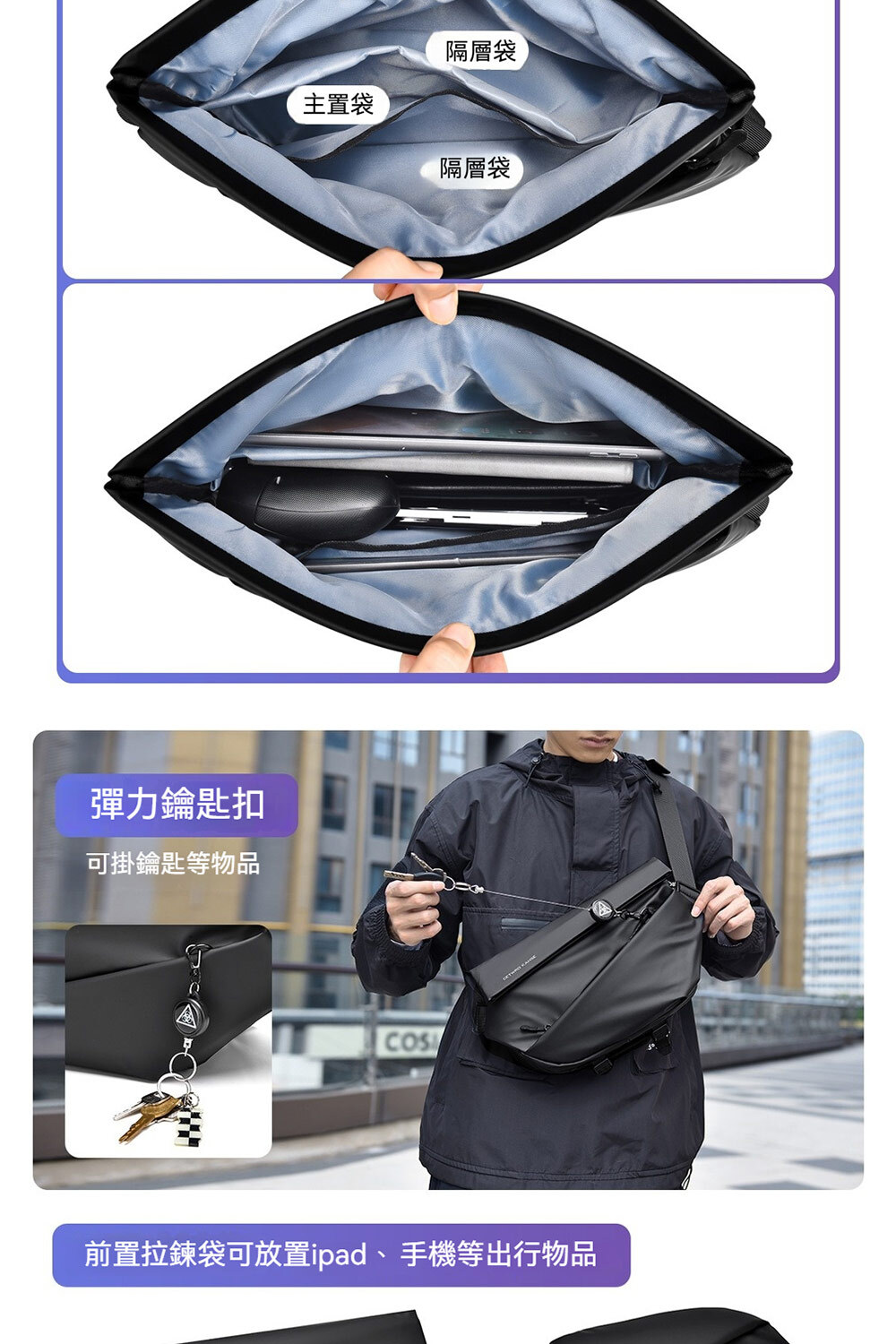 👜結構:主袋、隔層袋*2、前置拉鍊袋*2、後背拉鍊袋*1