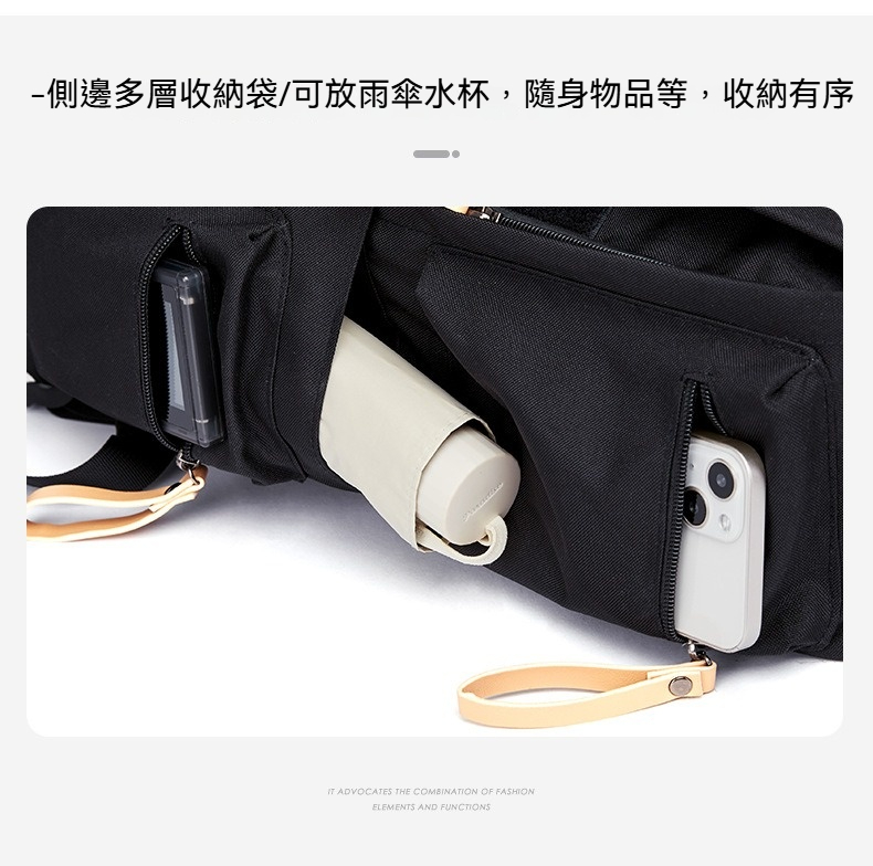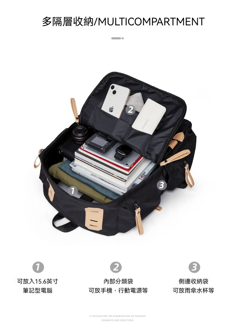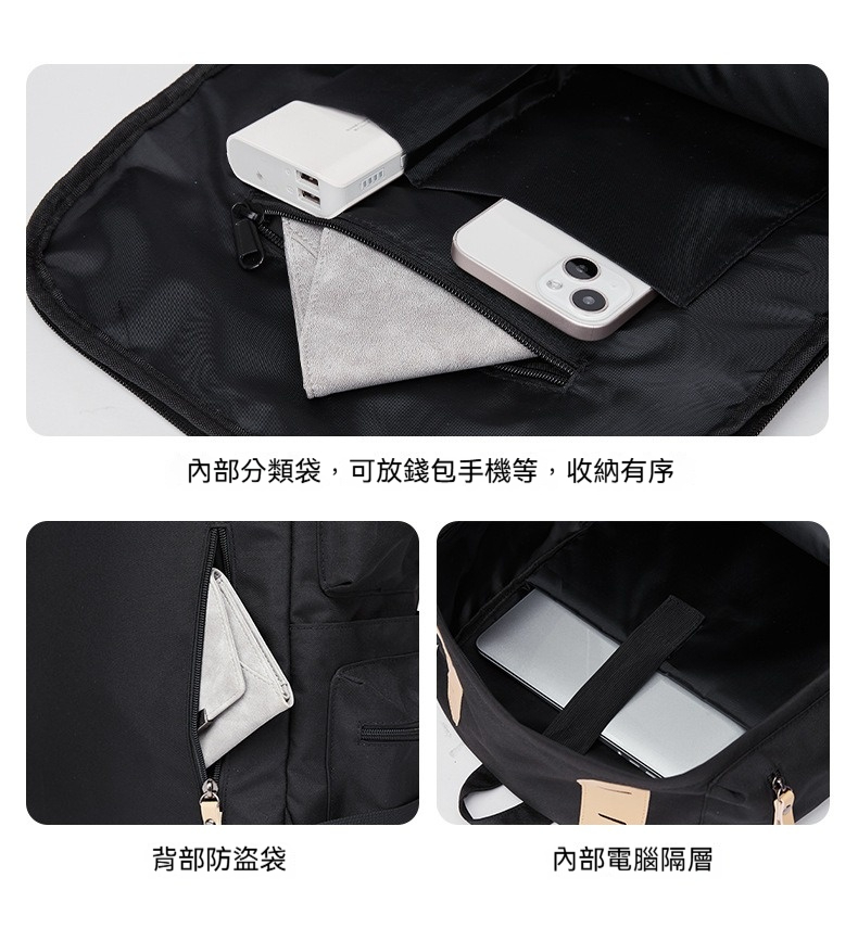 👜結構:主袋、前袋(魔鬼氈掀蓋)、側袋*2、後側袋、側邊拉鍊袋*4、內15.6英吋電腦隔層袋、內貼袋*2、內貼拉鍊袋