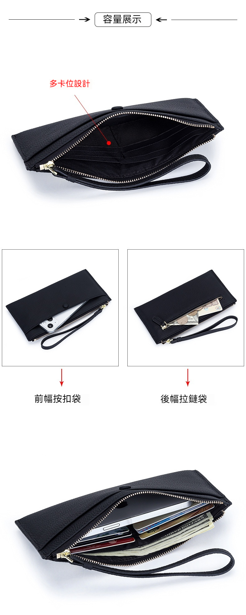 👜容量 / 結構:卡片位*6、手機位、大鈔位、前幅壓釦袋、後幅拉練貼袋