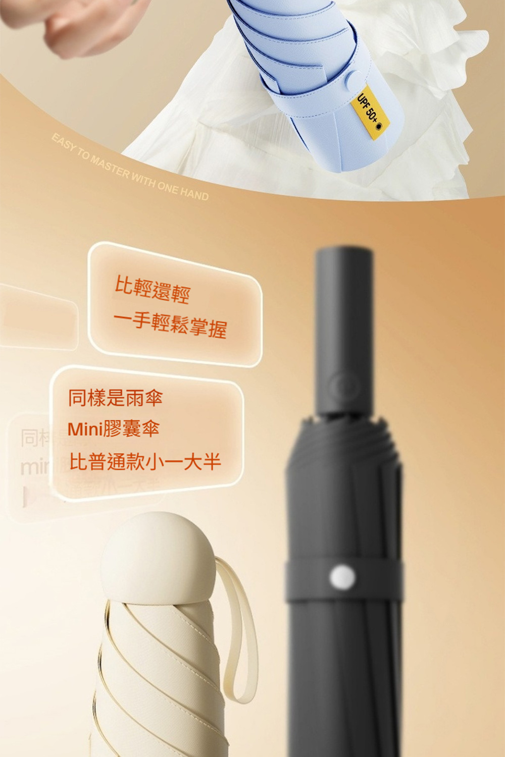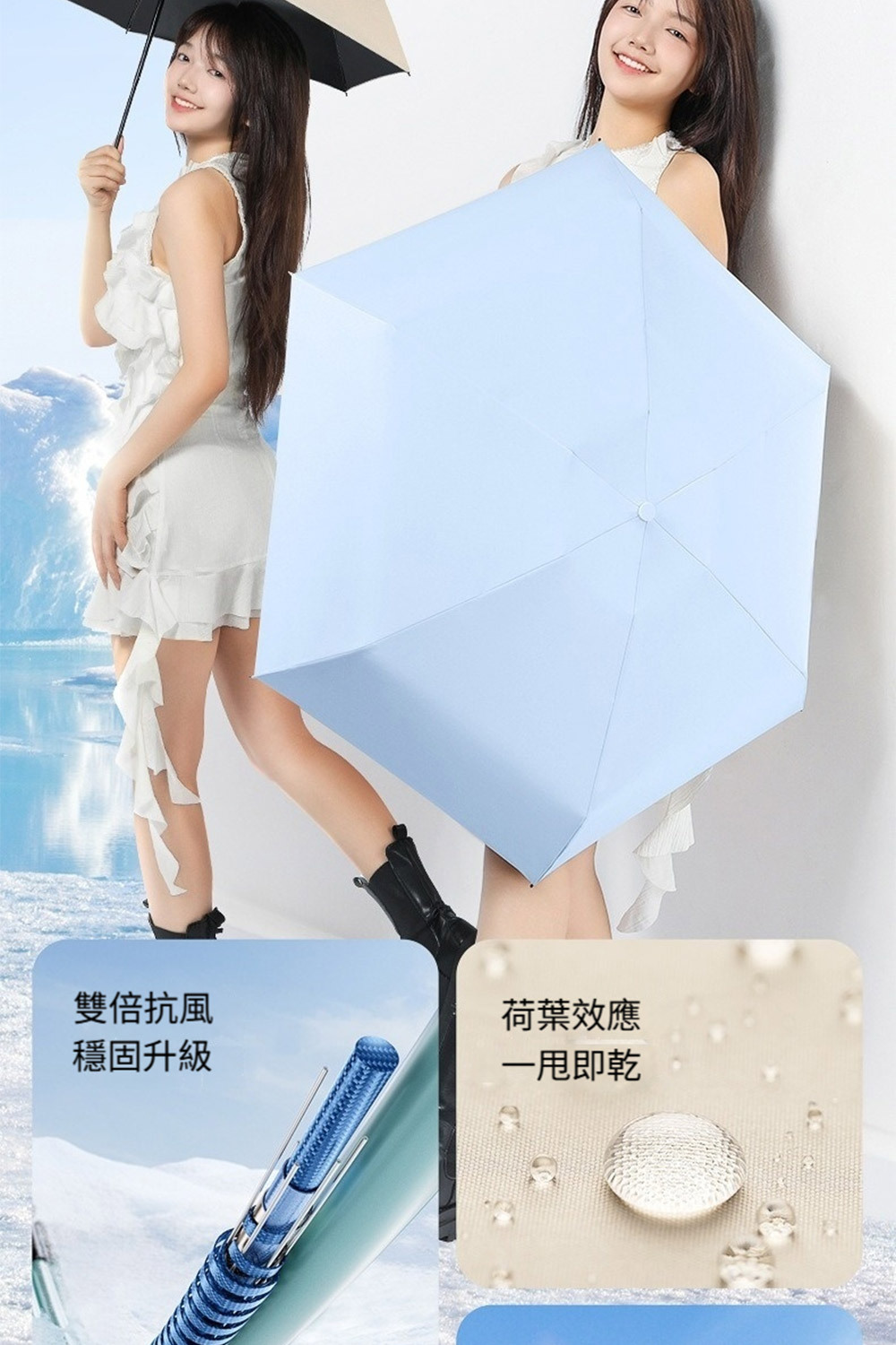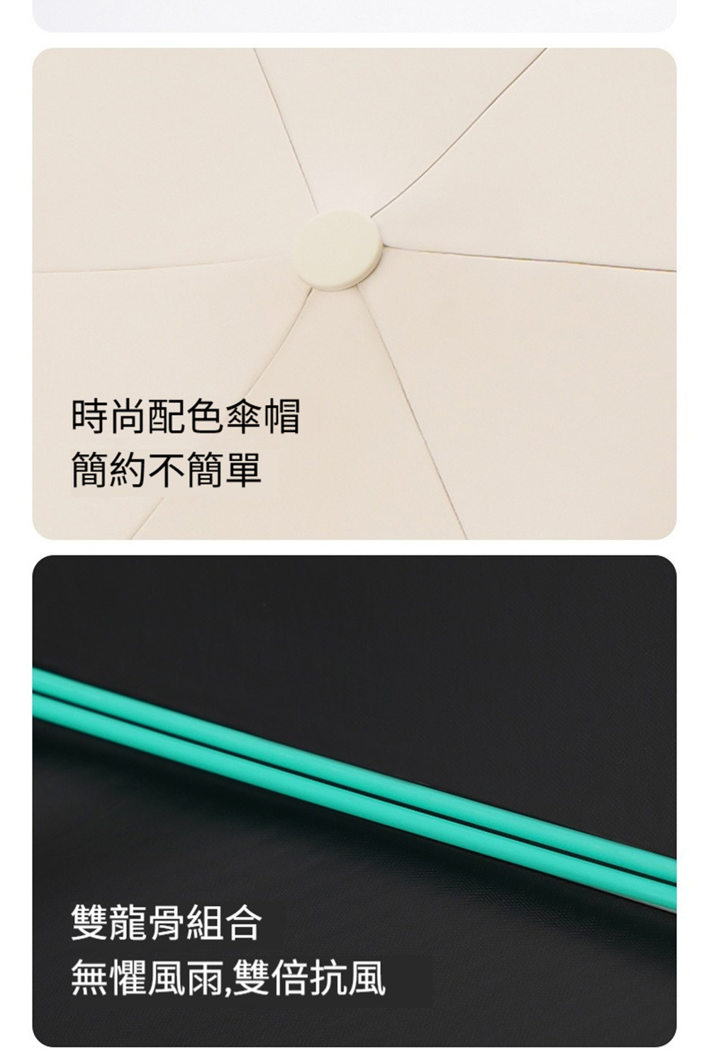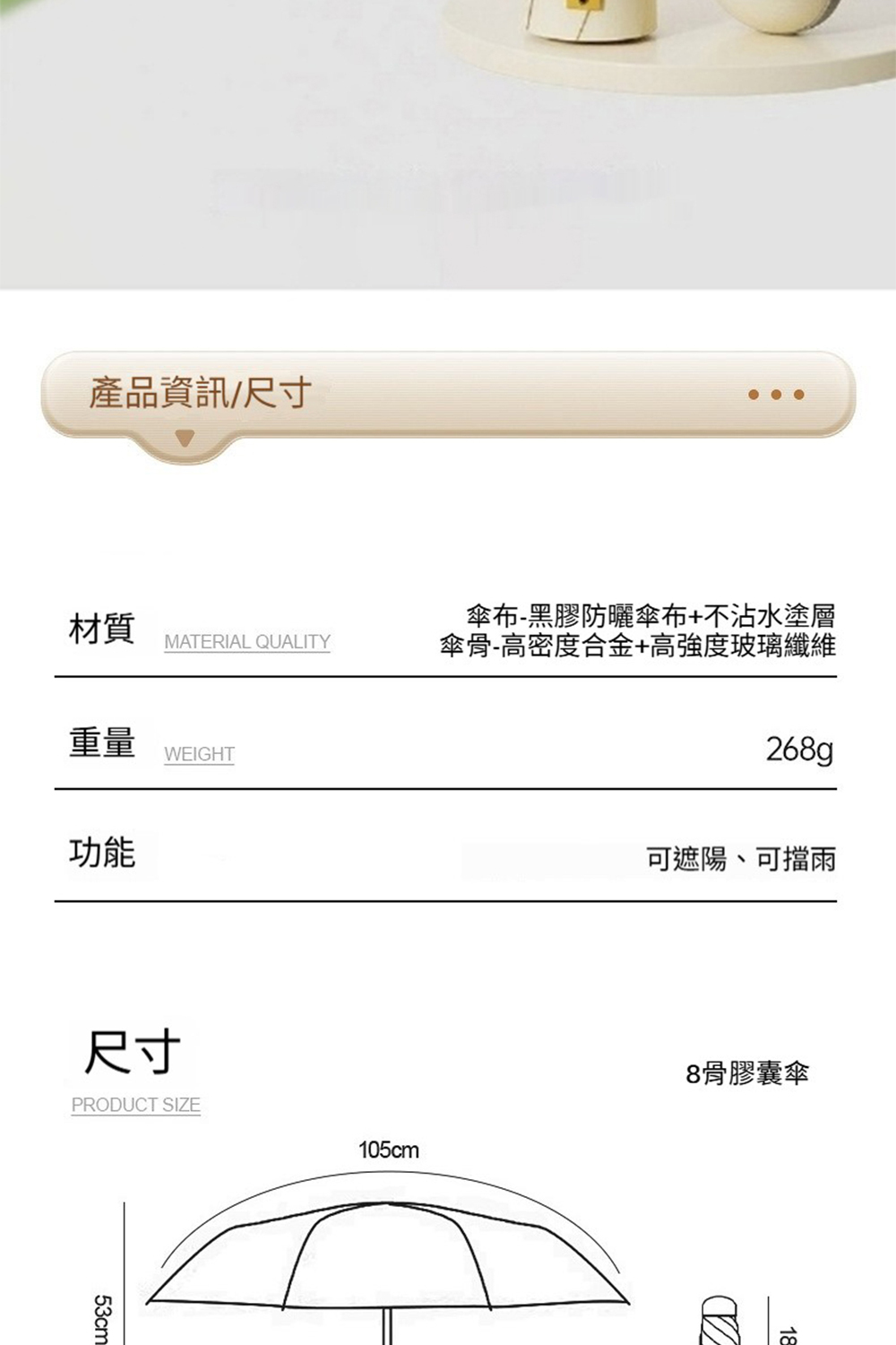 👜材質:傘布-黑膠防曬傘布+不沾水塗層,傘骨-高密度合金+高強度玻璃纖維