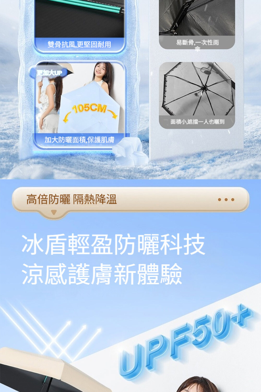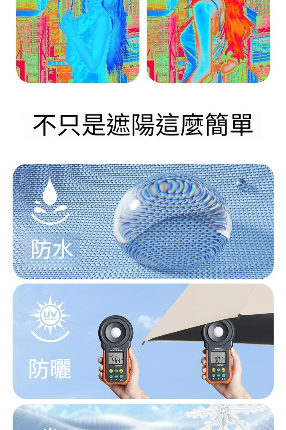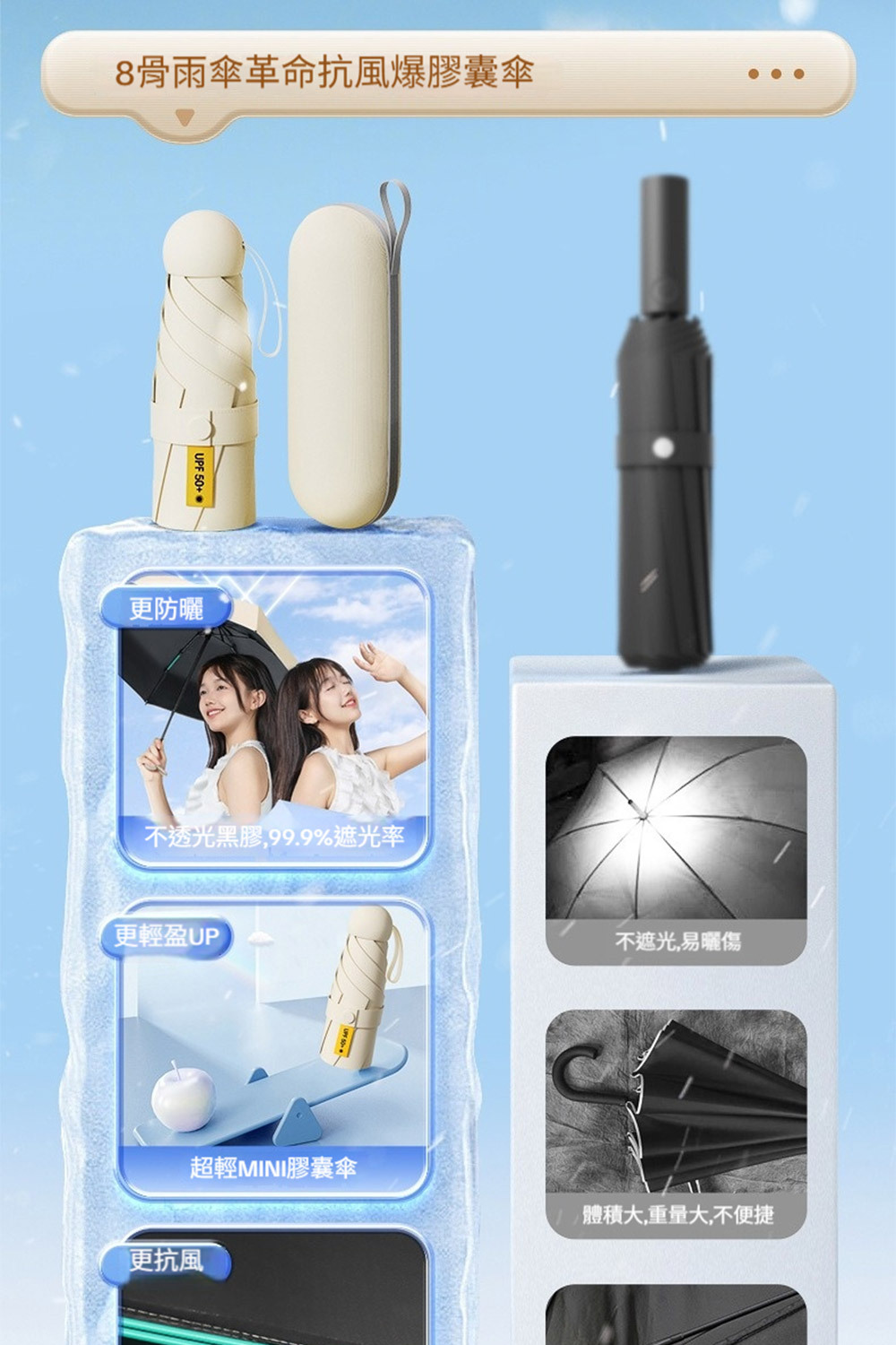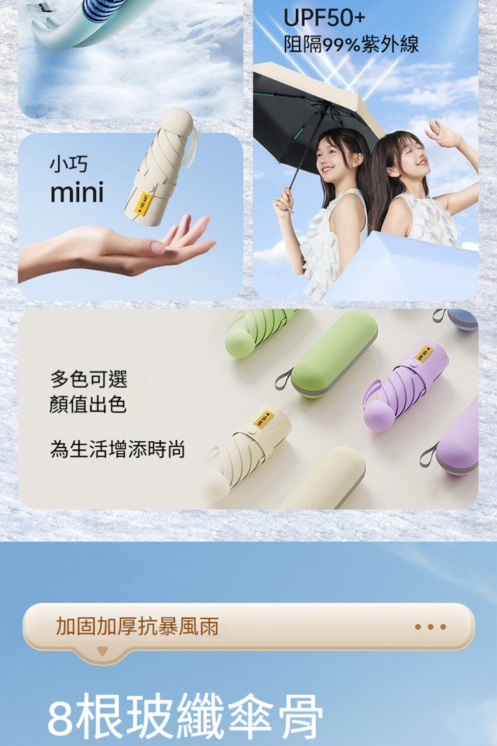 👜材質:傘布-黑膠防曬傘布+不沾水塗層,傘骨-高密度合金+高強度玻璃纖維